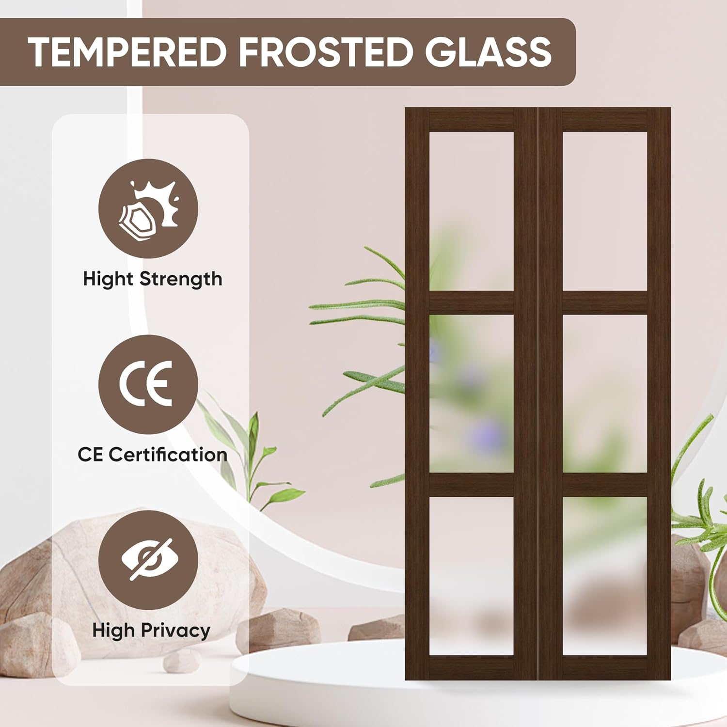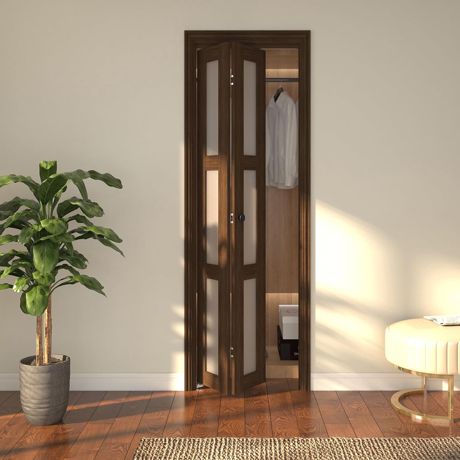JUBEST Bifold Closet Door, 36Inch Bi fold Interior Doors with Hardware Kit Include, 3-lite Tempered Frosted Glass Doors, Solid Wood Closet Door with MDF & Water-Proof PVC Surface, Brown
